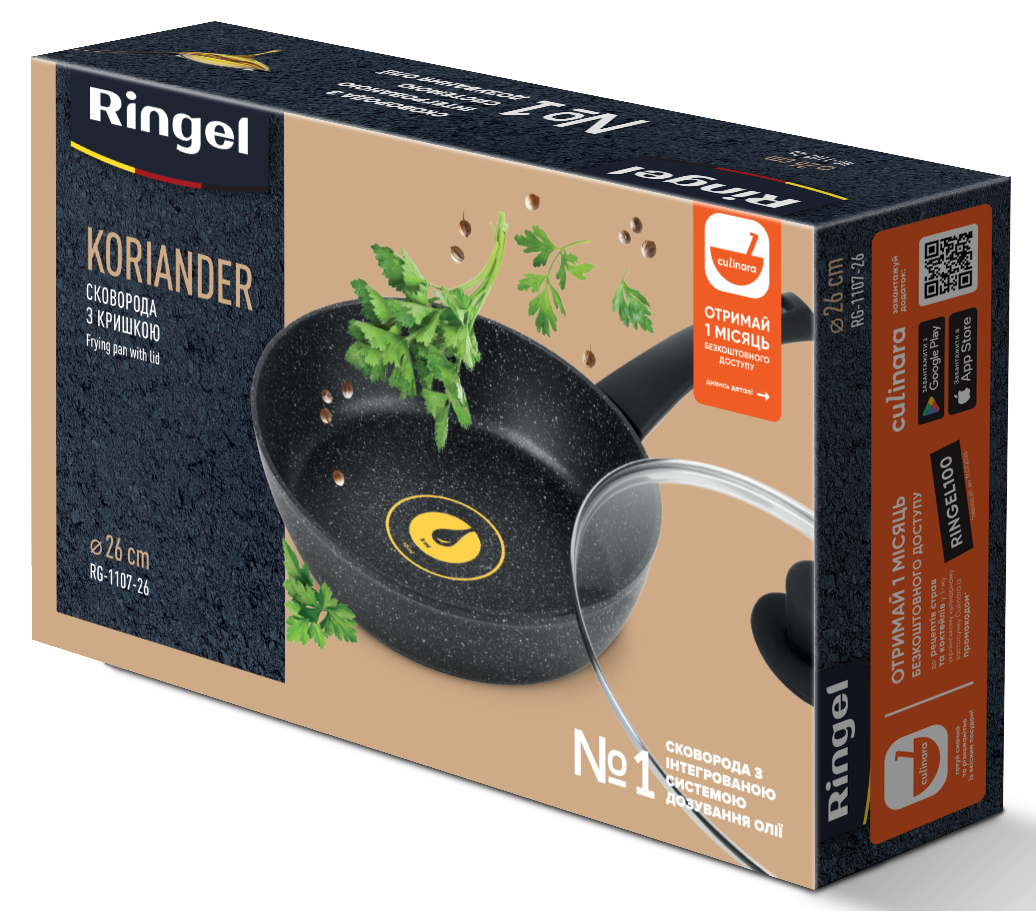 Коллекция сковородок Koriander, изготовлена из высококачественного кованого алюминия 3,2 мм и имеют сверхстойкое антипригарное мраморное покрытие Marble coating, которое является очень износостойким даже при интенсивном использовании. Продукция Koriander также имеет внешнее антипригарное покрытие для легкого ухода и длительного сохранения визуальной привлекательности.