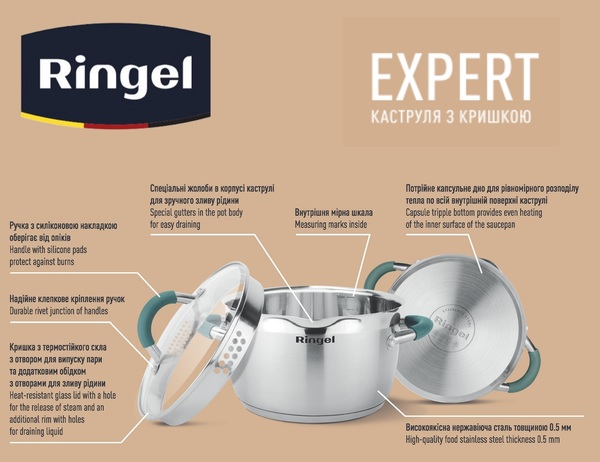 Каструля серії EXPERT від Ringel дозволить будь-якій господині легко та із задоволенням приготувати улюблені страви, підігріти швидко воду. Каструля серії EXPERT має європейський (RoHS, LFGB), американський (FDA) сертифікати якості, що підтверджує безпеку для здоров'я покупців. Готувати з каструлею Ringel можна на будь-яких типах поверхнях включаючи індукційну.