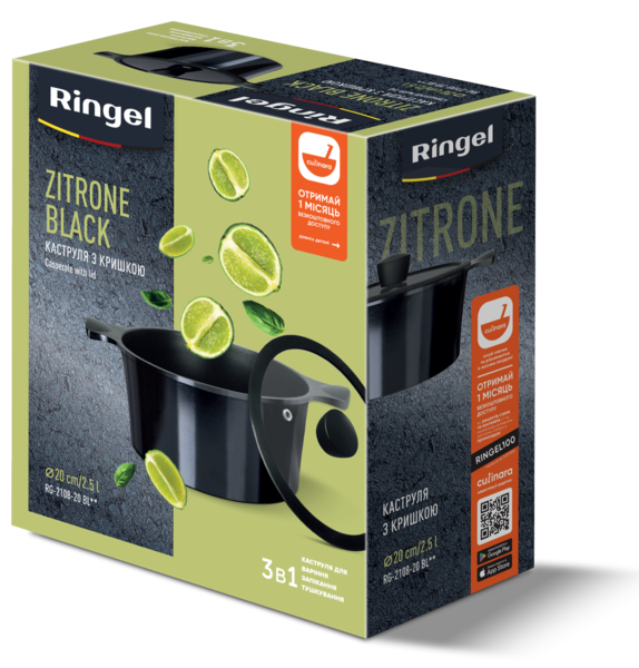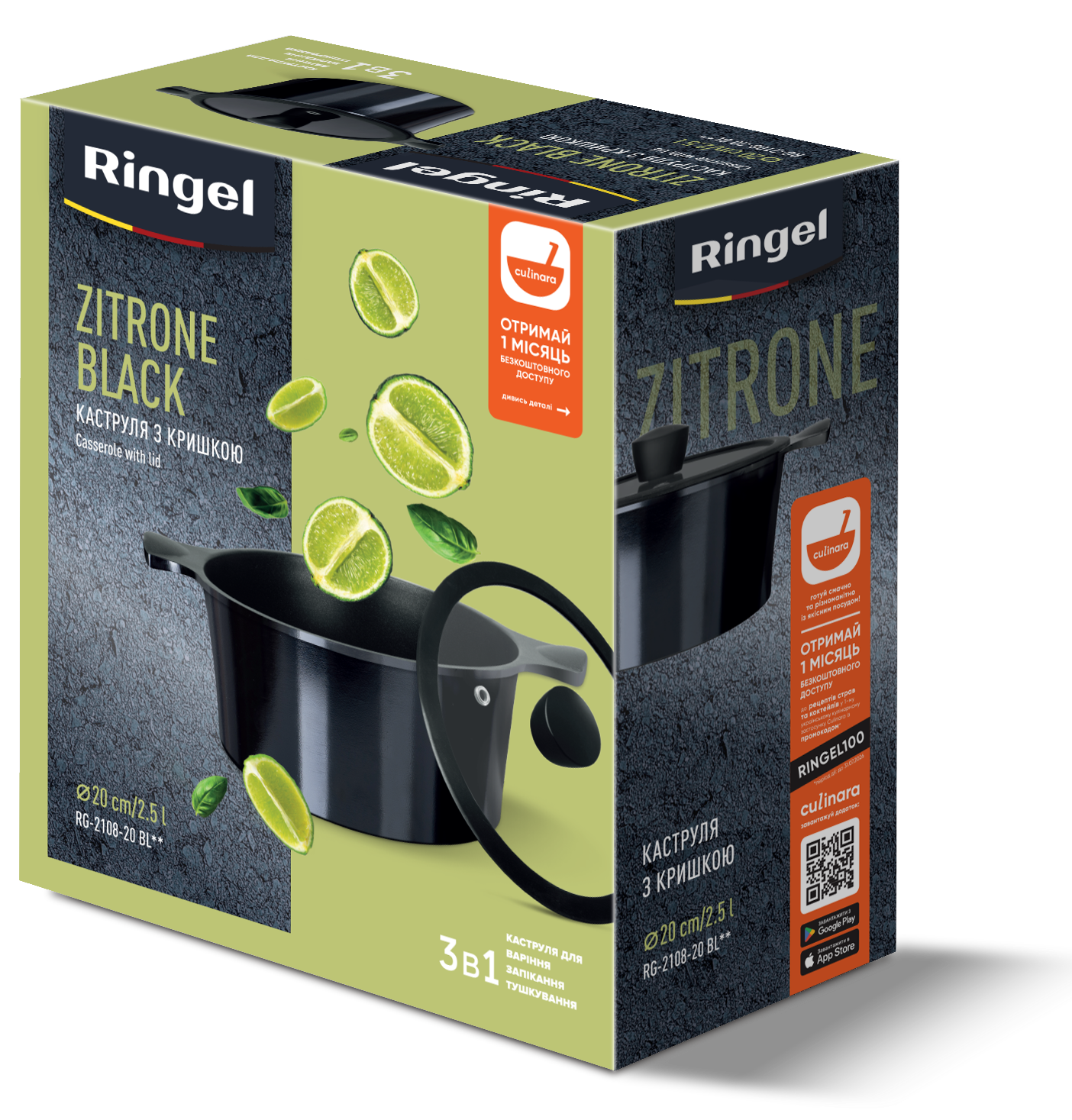 Каструля з литого алюмінію серії Zitrone від Ringel відрізняється товстостінною конструкцією та надійним антипригарним покриттям, завдяки чому цей вид посуду є максимально універсальним рішенням для приготування безлічі видів страв.